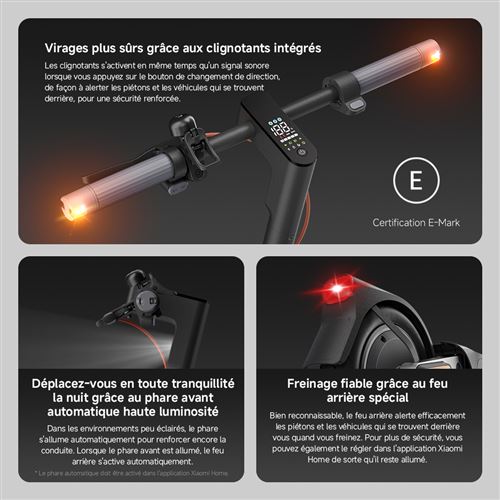 La trottinette électrique XIAOMI Scooter 5 Pro est conçue pour offrir une expérience de conduite exceptionnelle grâce à ses caractéristiques techniques. Dotée d'une puissance maximale de 1000W, elle permet de gravir des pentes jusqu'à 22%, assurant ainsi une performance optimale même sur des terrains inclinés. La sécurité est renforcée par un système de freinage double, combinant un frein mécanique à tambour à l'avant et un frein électronique à l'arrière. De plus, le système antipatinage (TCS) garantit une adhérence parfaite sur toutes les surfaces, qu'il s'agisse de ciment ou d'asphalte. Les clignotants avant et arrière, ainsi que les feux automatiques, augmentent la visibilité et la sécurité lors de vos trajets nocturnes.