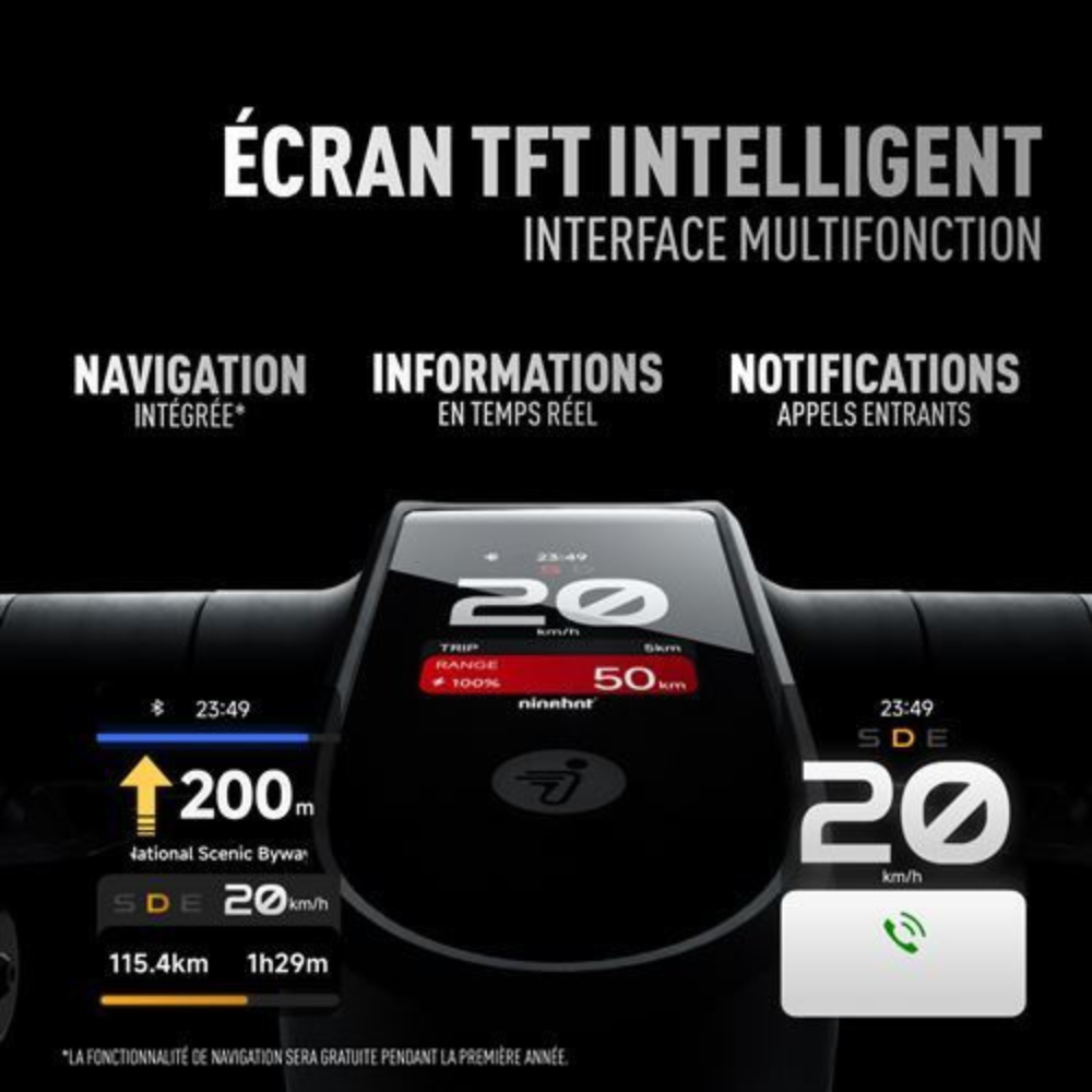Équipée de suspensions hydrauliques avant et arrière, la NINEBOT Max G3 E garantit une conduite fluide sur tous les terrains. Les pneus tubeless autocicatrisants de 11 pouces offrent une adhérence supérieure et une durabilité accrue. Le système de freinage à disque double piston assure un contrôle optimal, même à grande vitesse. Avec des fonctionnalités intelligentes telles que l'écran TFT pour des informations en temps réel et le système AirLock pour un déverrouillage sans clé, cette trottinette combine confort, sécurité et technologie avancée pour une expérience de conduite inégalée.
