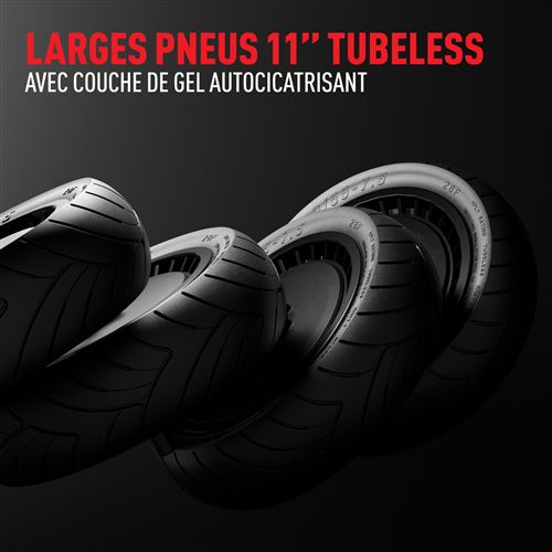 Les pneus sans chambre à air autocicatrisants de 11 pouces et d'une largeur de 80 mm offrent aux utilisateurs de la GT3 E une conduite plus souple et plus stable en ville et sur les chemins accidentés. La couche de gel autocicatrisant à l'intérieur des pneus peut résister aux crevaisons sans fuite d'air.