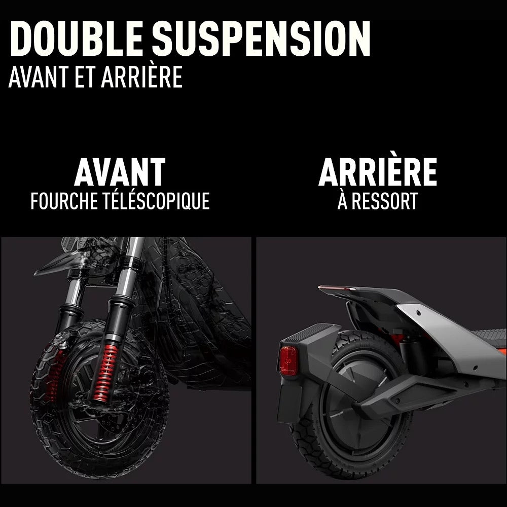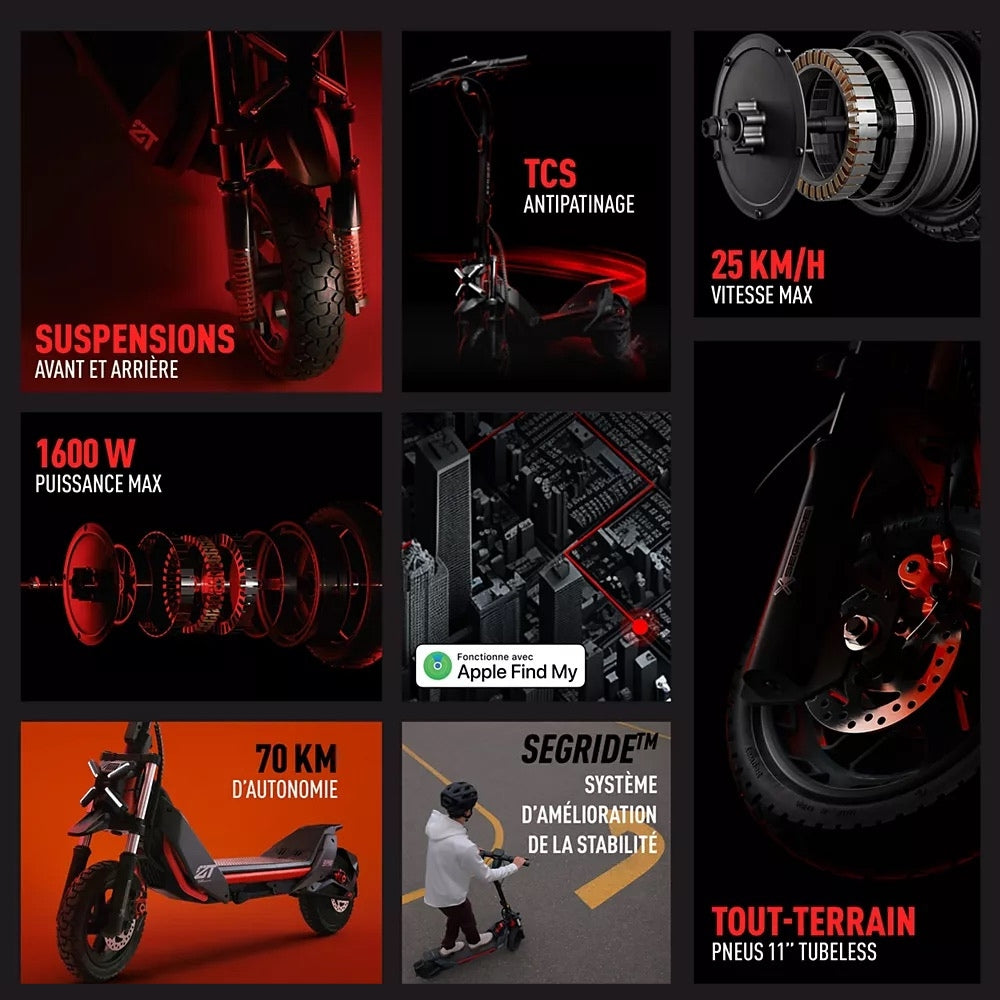 Segway ZT3 Pro E : La Trottinette electrique Tout-Terrain Par Excellence Trottinette electrique NINEBOT ZT3 ProPerformance et Autonomie pour l'Aventure Urbaine et Tout-Terrain La Segway ZT3 Pro E s'impose comme la compagne ideale pour les amateurs d'aventure urbaine et de sensations fortes en tout-terrain. Avec son moteur sans balai d'une puissance maximale de 1600 W, elle gravit aisement des pentes de 25 %. La technologie RideyLong™ garantit une autonomie remarquable de jusqu'à 70 km, permettant des escapades prolongees sans souci d'autonomie. Les pneus tout-terrain tubeless de 11 pouces offrent une adherence superieure, tandis que les doubles suspensions telescopiques à l'avant et à ressorts à l'arrière absorbent les irregularites pour une conduite fluide et confortable. Trottinette electrique NINEBOT ZT3 ProSecurite et Confort Connectes pour une Experience de Conduite Optimale La securite est au coeur de la conception de la ZT3 Pro E, avec un double système de freinage à disque et le système Segride™ qui ameliore la stabilite et le contrôle, même sur les surfaces glissantes. Le tableau de bord LED de 3 pouces affiche toutes les informations necessaires en temps reel. La visibilite est renforcee par un eclairage DEL de 4 W et des clignotants integres. La connectivite n'est pas en reste : l'application mobile Segway-Ninebot offre des fonctionnalites telles que le verrouillage AirLock et la localisation via Apple Find My. Enfin, son système de pliage pratique et une charge utile maximale de 120 kg rendent la ZT3 Pro E aussi pratique qu'efficace pour tous vos deplacements.