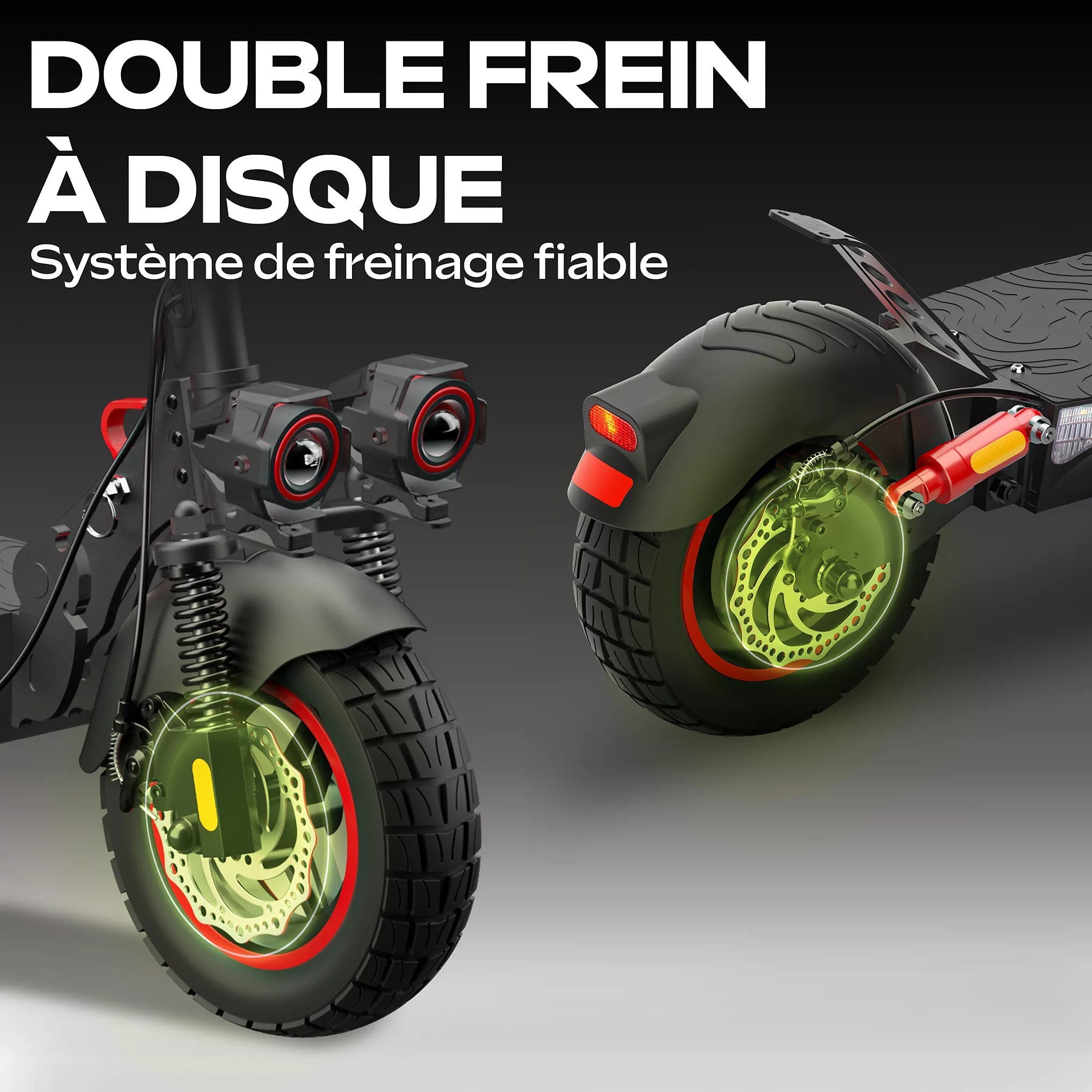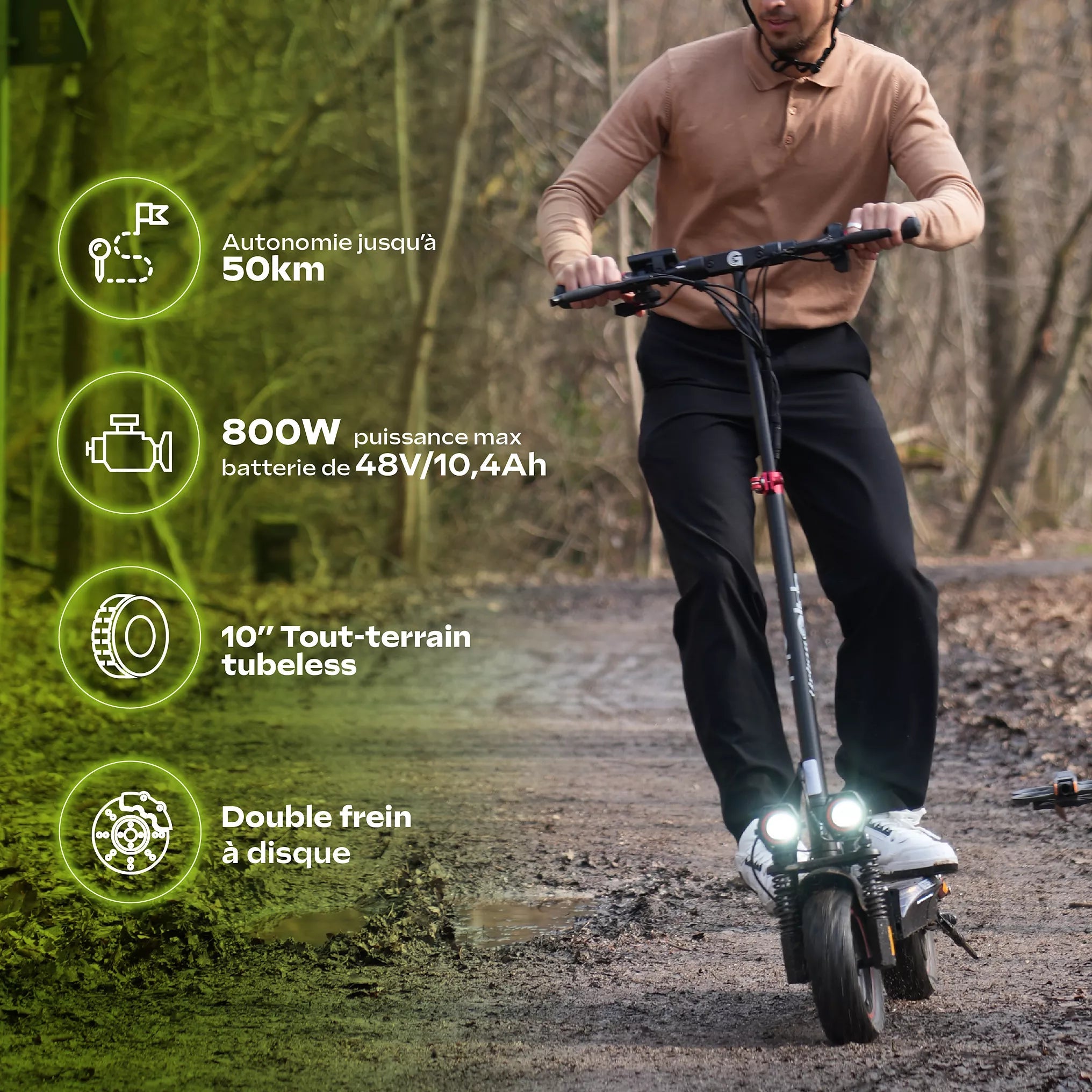 Grâce à ses pneus tubeless tout-terrain de 10 pouces et à sa suspension intégrée, la conduite reste stable et confortable, même sur des routes irrégulières ou des chemins légèrement accidentés. Le système de freinage à double disque avant et arrière garantit un arrêt efficace et sécurisé, quelles que soient les conditions.