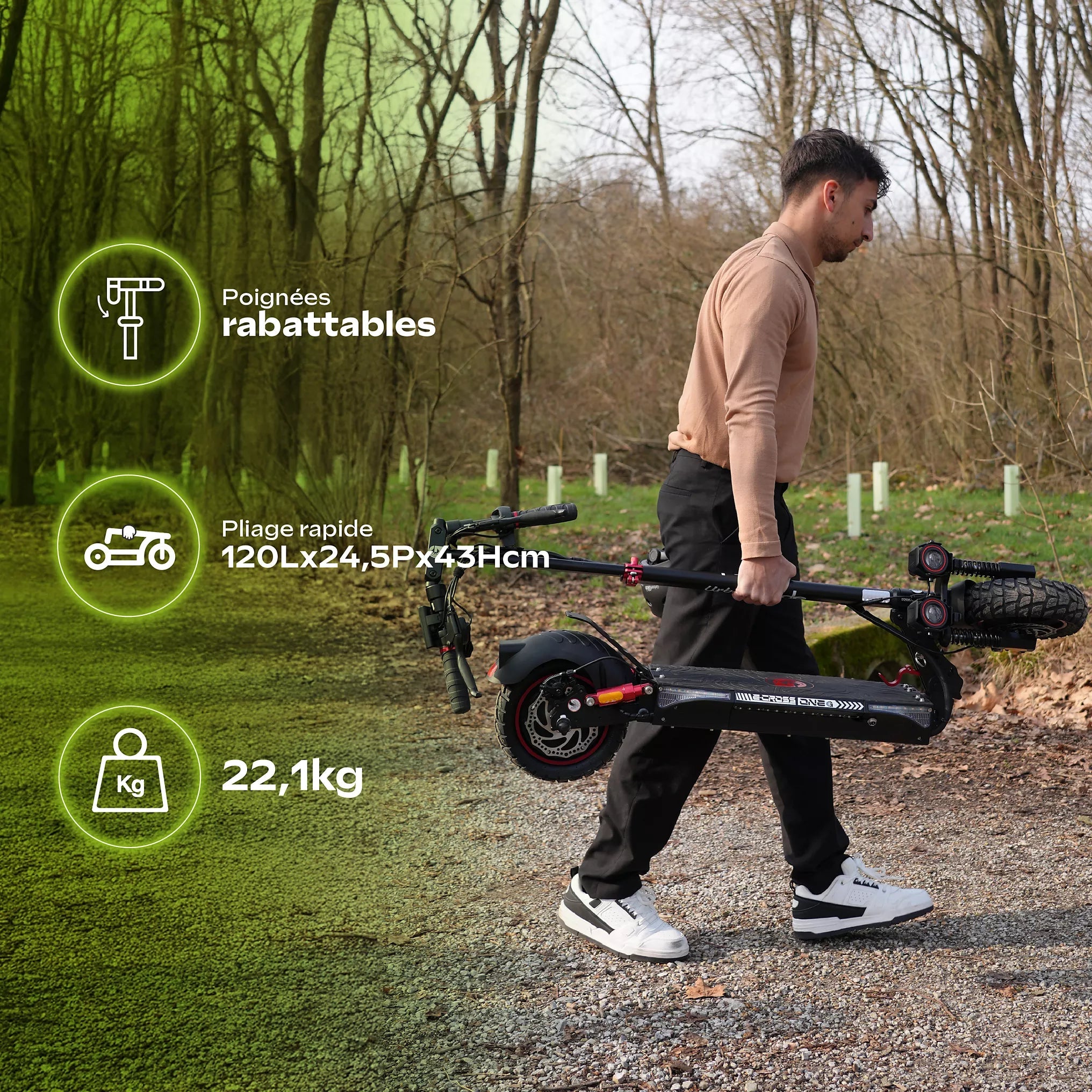 La trottinette électrique Urbanglide E-Cross ONE est pensée pour offrir un excellent équilibre entre puissance, autonomie et confort de conduite. Elle s’adresse aussi bien aux trajets quotidiens en ville qu’aux sorties sur chemins et routes plus exigeantes.