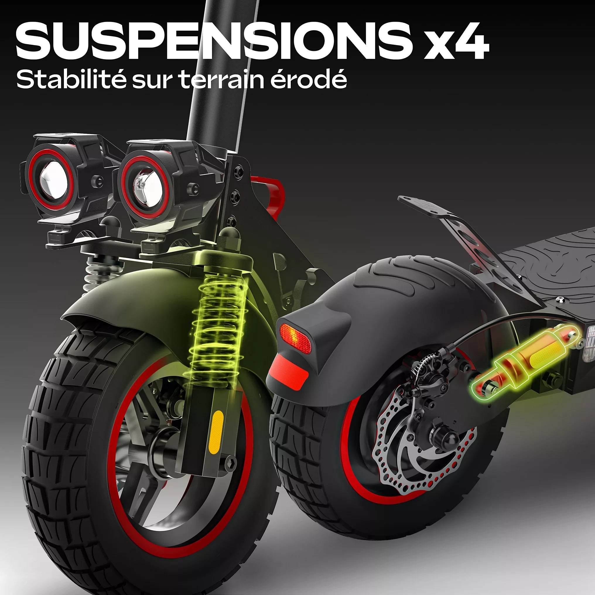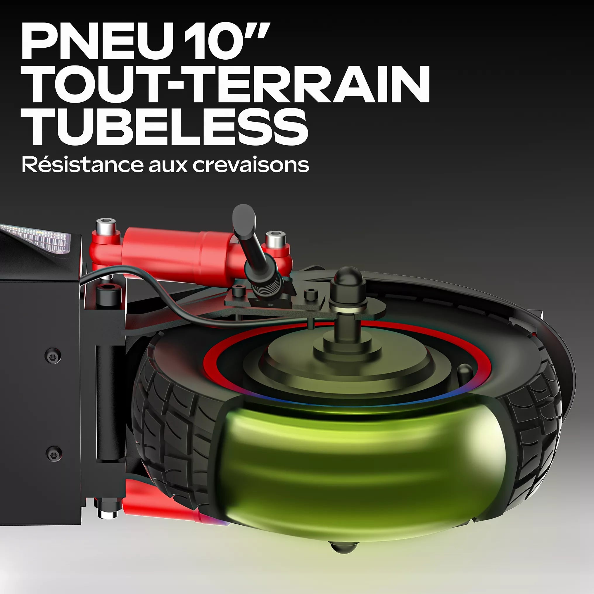 Pneus tubeless 10 pouces et suspension intégrée pour un confort optimal.
